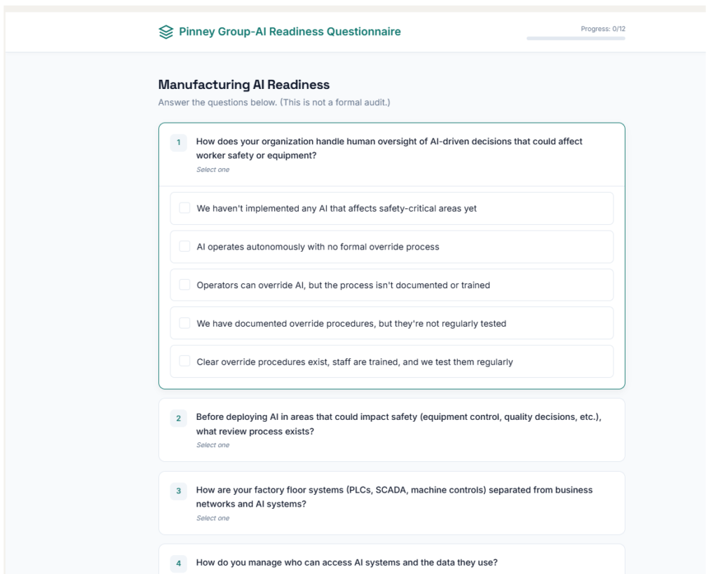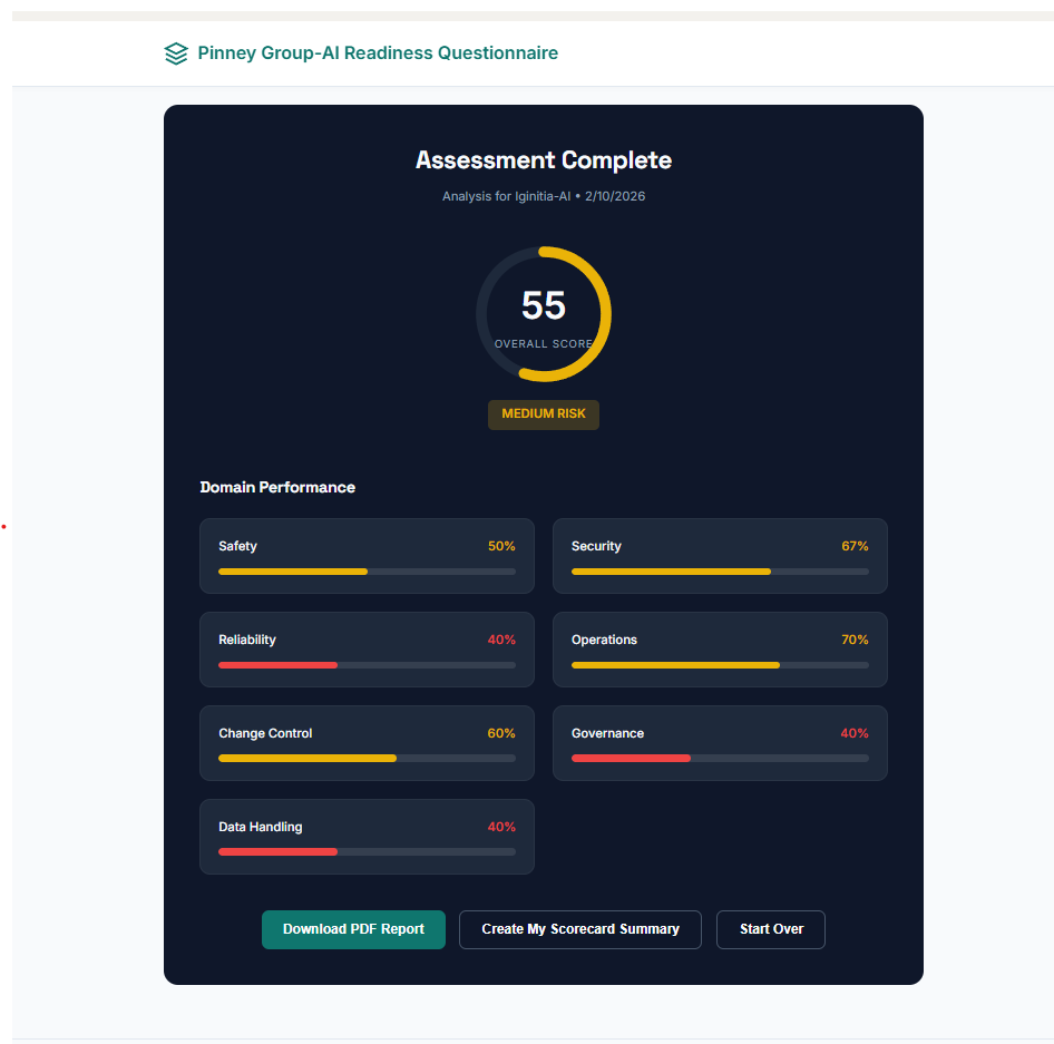 This AI Readiness Questionnaire is a structured diagnostic tool designed to help organizations quickly assess how prepared they are to adopt, scale, and govern AI responsibly. Through a guided set of practical, business-focused questions spanning data, security, operations, governance, and workforce readiness, it evaluates both technical foundations and organizational maturity. The platform converts responses into an executive-level scorecard with domain benchmarks, risk indicators, and prioritized next steps, giving leadership a clear view of where they stand today and what actions will drive the most immediate impact. The result is a concise, actionable roadmap that helps companies move forward with AI confidently, safely, and aligned to real business outcomes rather than hype.