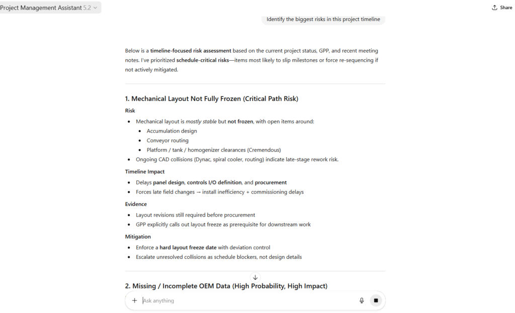 Project Management Assistant is an AI co-pilot built for food and beverage manufacturing projects. It analyzes real project documents, standards, meeting notes, and live timelines to identify schedule risks, integration gaps, and execution bottlenecks and then translates them into clear, actionable guidance. Designed for senior project managers and engineers, it supports layout freeze decisions, long-lead procurement planning, controls and electrical alignment, commissioning readiness, and stakeholder communication. The result is faster decisions, fewer late surprises, and tighter control of complex, multi-vendor manufacturing initiatives.