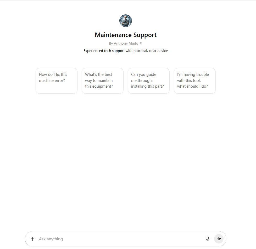 Maintenance Support Agent is an AI-powered assistant designed specifically for manufacturing environments, helping operators, technicians, and maintenance teams quickly understand, operate, and troubleshoot complex equipment using official machine documentation and orientation manuals. It provides clear, role-appropriate guidance on machine operation, safety devices, sensors, HMI screens, alarms, sequences of operation, and common issues with the goal of reducing downtime, improving safety, and standardizing knowledge across shifts. By giving workers instant, reliable answers drawn only from approved documentation, this GPT helps manufacturing companies preserve tribal knowledge, speed up training, support maintenance teams, and keep production running efficiently without relying on guesswork or external resources.