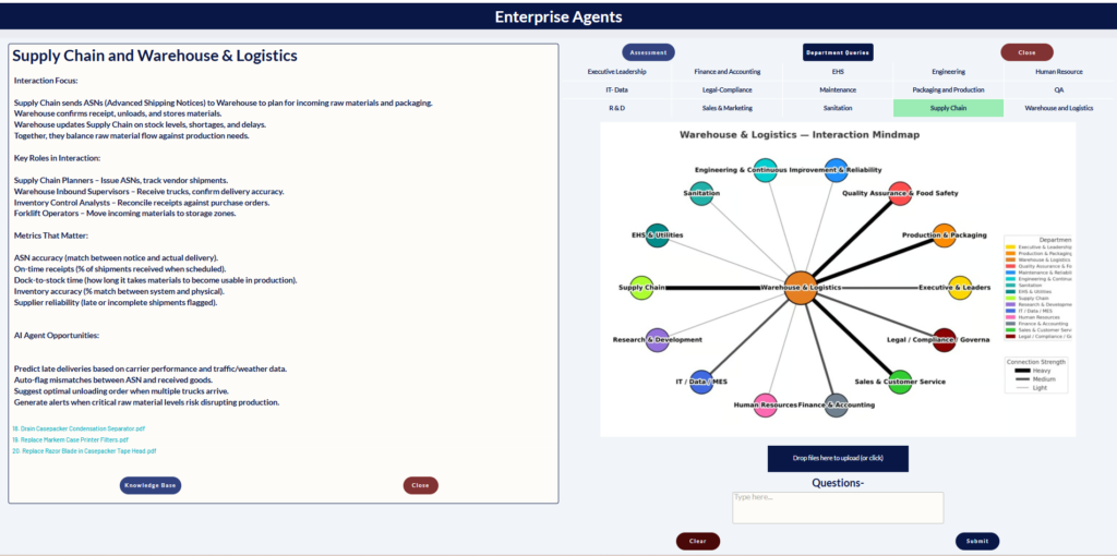 Enterprise Agents is an AI-powered organizational intelligence platform that maps and analyzes the complex interactions between departments across your enterprise. By visualizing how functions like Supply Chain, Warehouse & Logistics, Production, Quality Assurance, and Engineering interconnect, the platform identifies key roles, tracks critical metrics (like ASN accuracy, dock-to-stock time, and inventory accuracy), and surfaces AI agent opportunities such as predicting late deliveries based on carrier performance and weather data, auto-flagging mismatches between shipping notices and received goods, or generating alerts when raw material levels risk disrupting production. With an integrated knowledge base linking to relevant SOPs and procedures, Enterprise Agents helps organizations understand cross-functional dependencies and deploy targeted AI solutions that improve operational efficiency across the entire value chain.