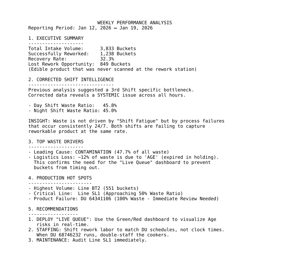 Waste Tracking Tool This tool is a flexible, shop-floor-ready tracking platform designed to capture, standardize, and analyze virtually any event in a manufacturing environment. While often deployed for waste, it is intentionally built to handle anything that needs to be measured or explained on the line: production losses, quality holds, rework, downtime, material movement, changeovers, sanitation events, safety incidents, or custom operational KPIs. Operators interact through fast, scan-based or touch-friendly workflows, while supervisors and engineers get structured, time-stamped data that is immediately usable for reporting, root-cause analysis, and continuous improvement. The result is a single, adaptable system that turns everyday manufacturing activity into reliable data, without forcing the plant to change how it actually runs.